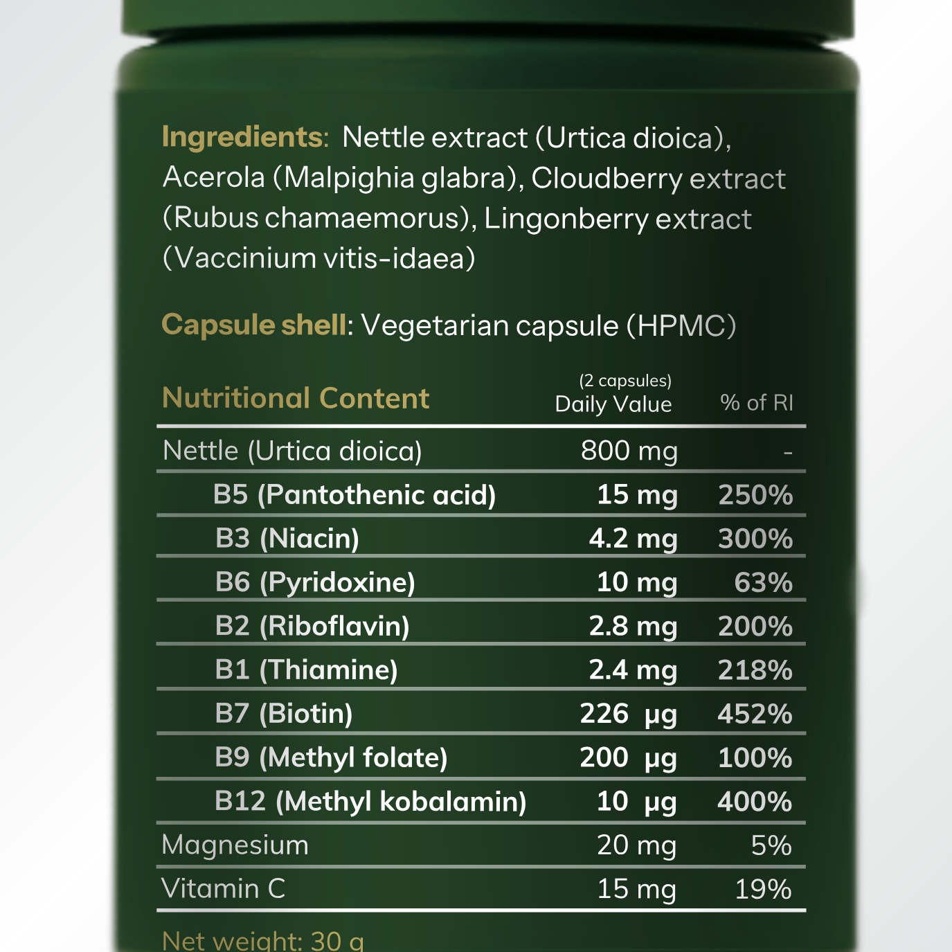 Brennesle inneholder naturlig B-vitaminer, vitamin C, jern og antioksidanter. Den støtter blodets vitalitet, avgiftning og energiproduksjon.