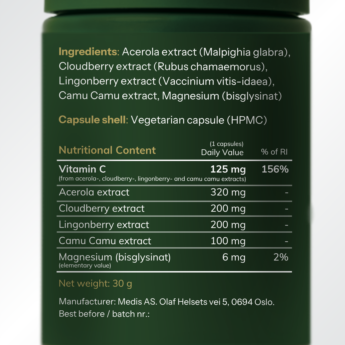 Acerolaekstrakt (Malpighia glabra), Multeekstrakt (Rubus chamaemorus), Tyttebærekstrakt (Vaccinium vitis-idaea), Camu Camu-ekstrakt (Myrciaria dubia), Magnesium (bisglysinat)