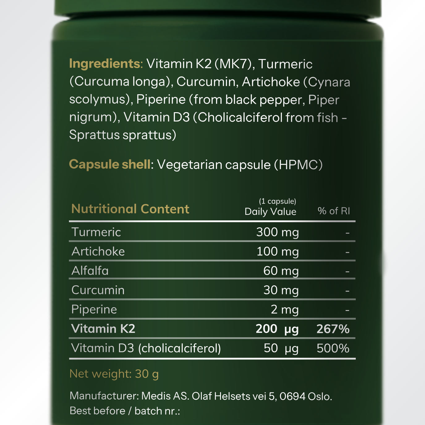 Vitamin K2 (MK-7), Gurkemeie (Curcuma longa), Artisjokk (Cynara scolymus), Piperin (fra svart pepper, Piper nigrum), Vitamin D3 (Kolekalsiferol fra fisk, Europeisk brisling – Sprattus sprattus)
